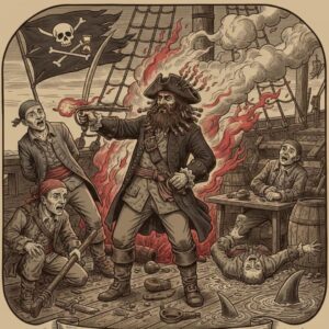 Quando assumiu seu próprio navio, o Queen Anne’s Revenge, armado com 40 canhões, sua transformação começou. Ele iniciou o uso da guerra psicológica nos mares, entendendo que a antecipação da violência é muitas vezes mais poderosa do que a violência em si. Ele cultivou uma aparência tão pavorosa que marinheiros se rendiam apenas ao ver sua bandeira. O ritual mais famoso do Barba Negra era tecer pavios de cânhamo de queima lenta em sua enorme barba e sob seu chapéu antes das batalhas. Esses pavios fumegavam, criando uma aura infernal em volta de sua cabeça. Testemunhas descreviam-no emergindo da fumaça dos canhões como um demônio saído do abismo, com olhos brilhando como brasas através da névoa sulfurosa. Essa apresentação teatral servia para criar terror imediato e torná-lo uma figura sobrenatural aos olhos dos supersticiosos marinheiros da época. Além disso, ele carregava seis ou mais pistolas em bandoleiras cruzadas no peito, permitindo disparos rápidos e sucessivos, criando uma impressão de violência imparável.