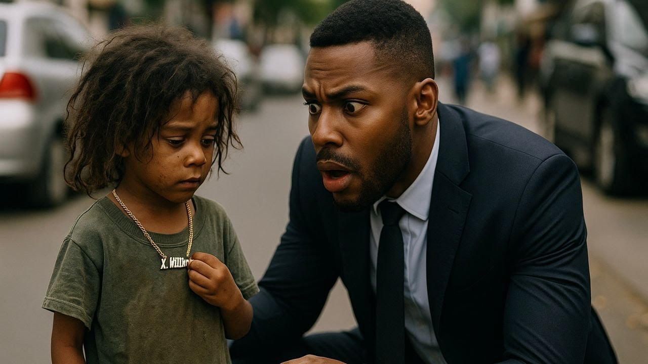 Na movimentada rua da cidade, um SUV preto estava se movendo lentamente pela mesma rua. Dentro estava Kelvin, olhando pela janela em silêncio. Ele estava imerso em seus pensamentos. A notícia da gravidez de Trisha ainda ecoava em sua cabeça. “Eu vou ser pai,” ele sussurrou para si mesmo. Mas algo não estava certo. Seu peito estava apertado. Ele não conseguia explicar por que se sentia assim. Ele olhou para fora da janela, perdido no silêncio. Bem naquele momento, algo aconteceu. Uma menina correu pela calçada, chorando e segurando seu colar enquanto corria. As pessoas olhavam, mas ninguém a parou. O coração de Kelvin pulou. Algo na menina, algo em suas lágrimas, tocou-o profundamente. “Pare o carro,” disse Kelvin de repente. O motorista freou rapidamente. “Pare o carro agora.” Antes que o motorista pudesse perguntar mais, Kelvin abriu a porta e saltou para fora. Ele correu atrás da menina. “Ei, menina, pare,” ele chamou gentilmente. A menina, Vera, virou-se e olhou para trás. Suas bochechas estavam molhadas. Seus chinelos estavam empoeirados. Sua pequena mão segurava o dinheiro com força. Kelvin se abaixou lentamente na frente dela, respirando com dificuldade. “Por que você está chorando?” ele perguntou. Vera limpou os olhos. “Minha mãe está doente. Eu estou indo comprar remédios para ela.” Kelvin olhou para ela atentamente e parou. Seus olhos caíram sobre o peito dela. Estava lá, o colar dele, seu colar de ouro, aquele com o nome de sua família, ‘K. Williams’.