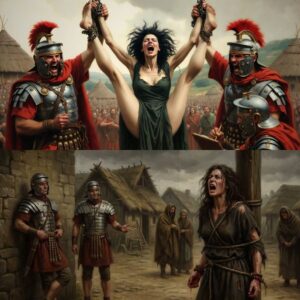 O que aconteceu a seguir foi registrado pelo historiador romano Tácito, cujo sogro serviu na Britânia durante esse período. Tácito não esconde o que aconteceu. Ele não suaviza a situação. Ele descreve a situação com um horror tão explícito que revela que até mesmo os romanos se sentiam perturbados com as ações de seus oficiais. Boudica foi presa por soldados diante de seu próprio povo. Eles a humilharam em praça pública. A rainha que governou ao lado do marido durante décadas foi humilhada perante seus súditos. Eles a amarraram a um poste e a açoitaram. Um açoite romano não era como ser atingido com um cinto. Eles usavam um chicote, um tipo de chicote com várias tiras de couro incrustadas com bolas de metal e fragmentos de osso de ovelha. Cada golpe arrancava a carne do músculo. Cada golpe deixava feridas que cicatrizariam para a vida toda. As vítimas frequentemente morriam apenas por causa do açoitamento.